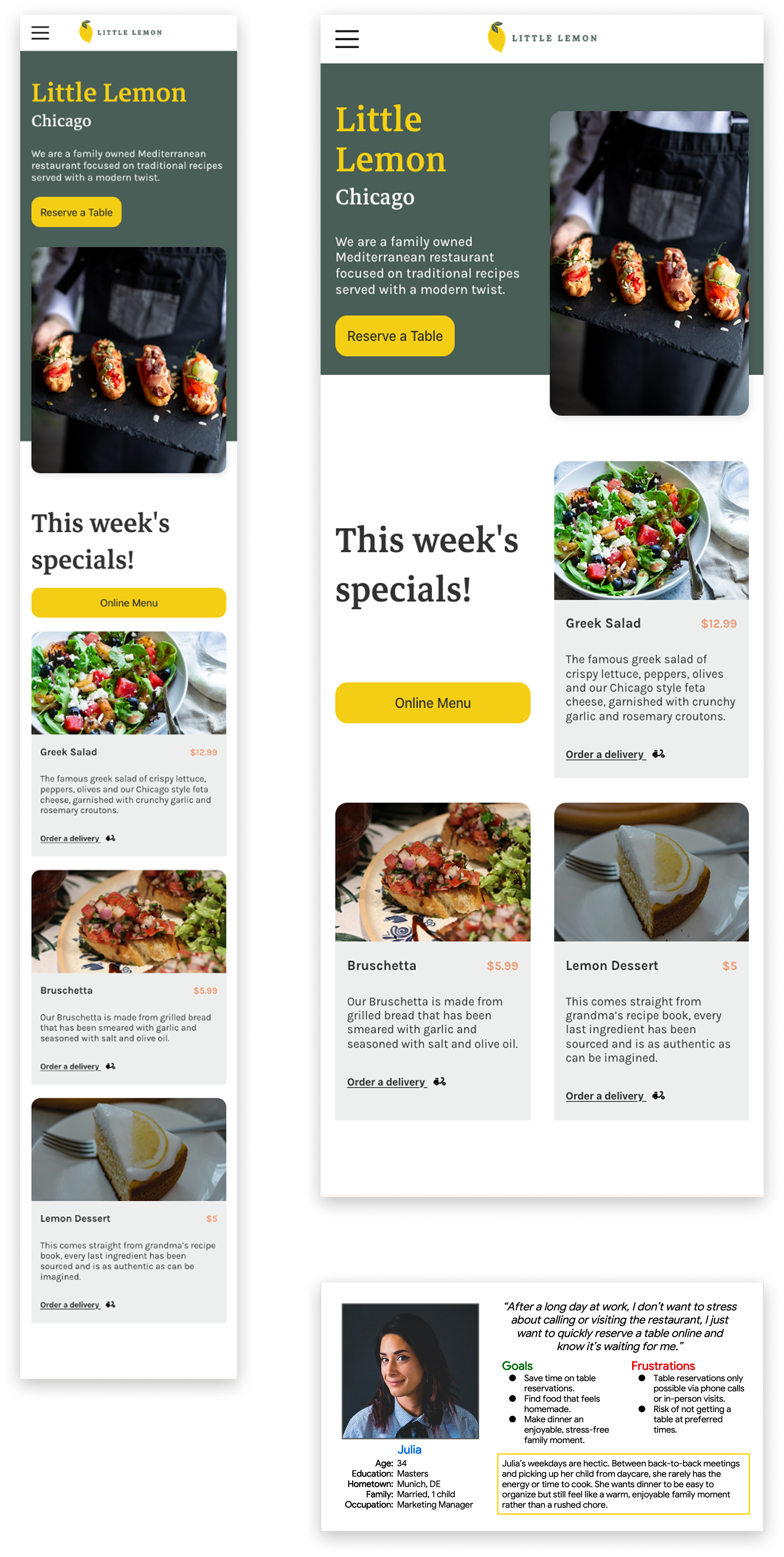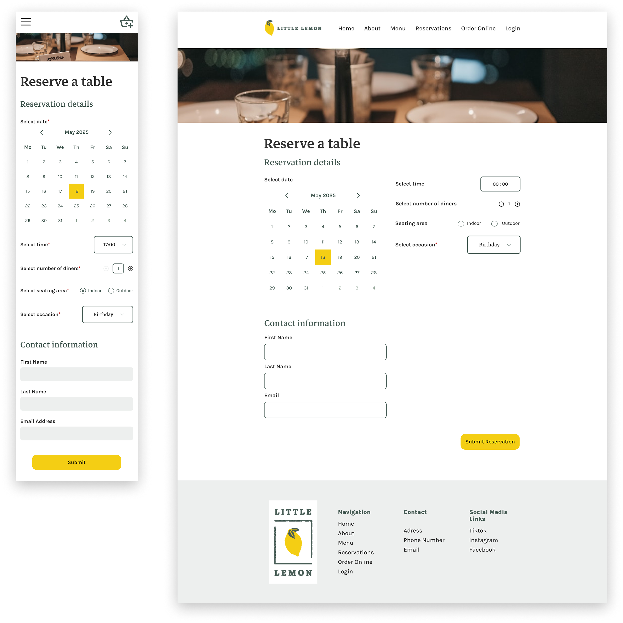My goal was to implement the homepage from the existing high-fidelity design and design and develop a fully responsive, accessible reservation page that would simplify the booking process for users and modernize the restaurant’s digital experience.